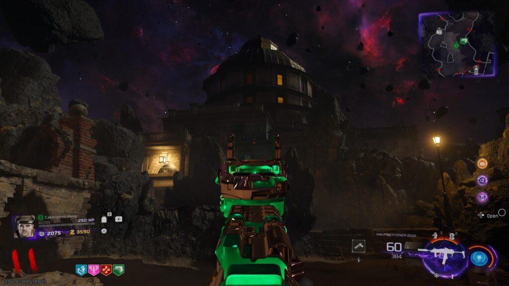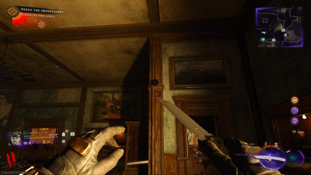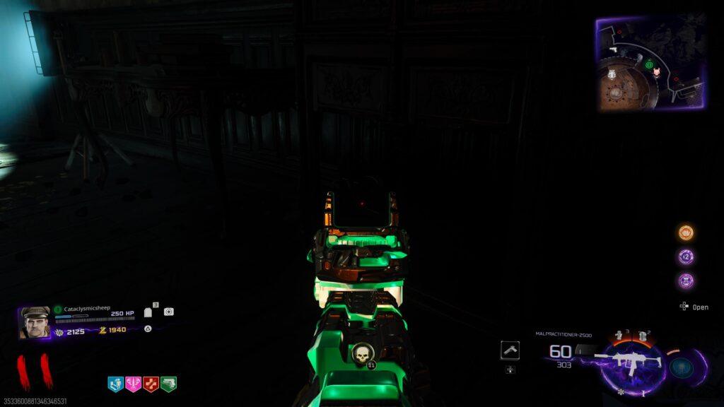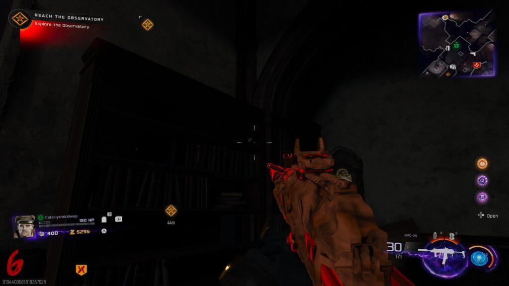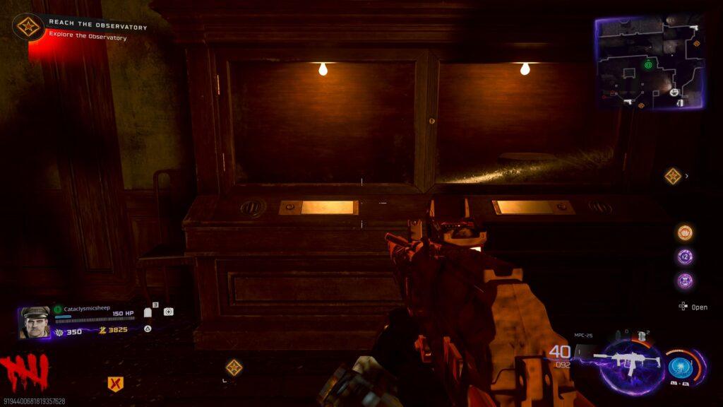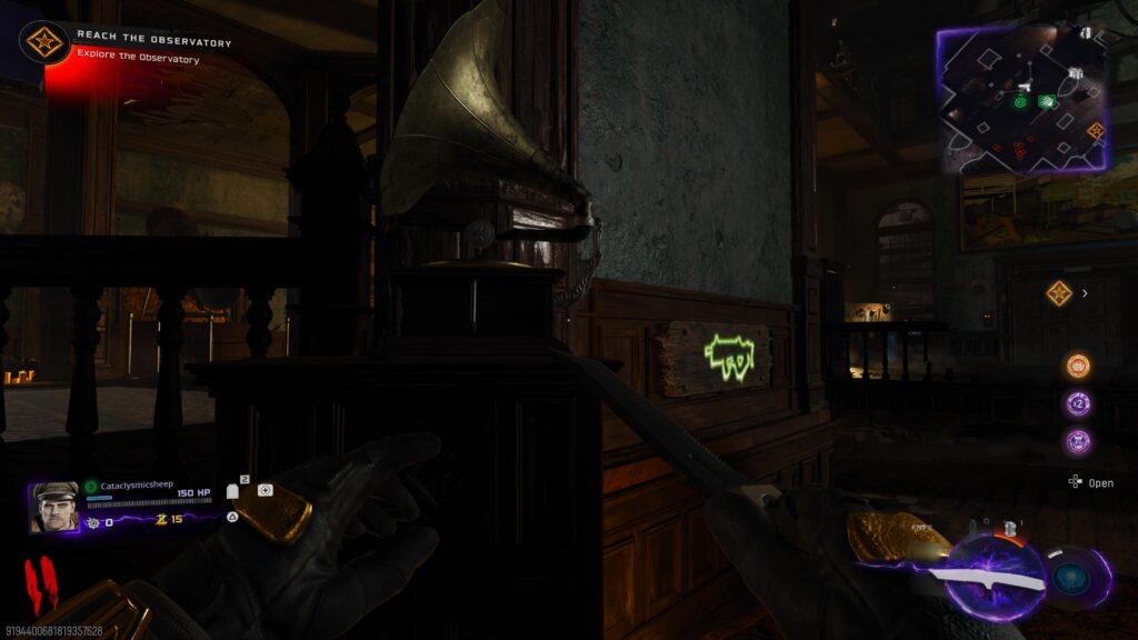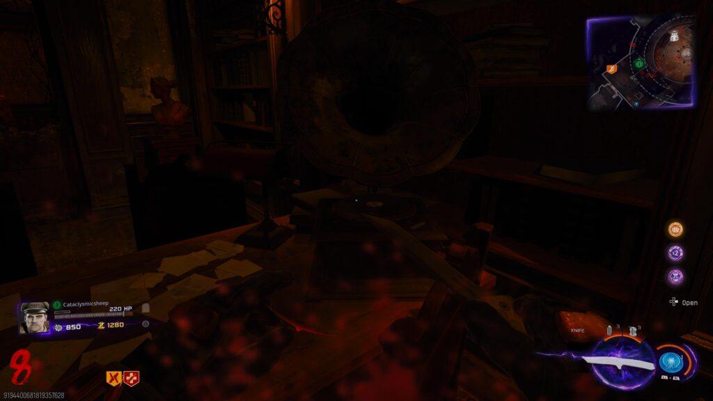 Ahora busca el tocadiscos justo antes de salir al pasillo que conecta con el Telescopio. Coloca el disco interactuando para comenzar el ritual. En este caso tendrás que eliminar zombis con tu Mejora de Campo. Cuando el tocadiscos reciba suficientes almas, tocará su canción y al terminar soltará una ventaja aleatoria y restos.