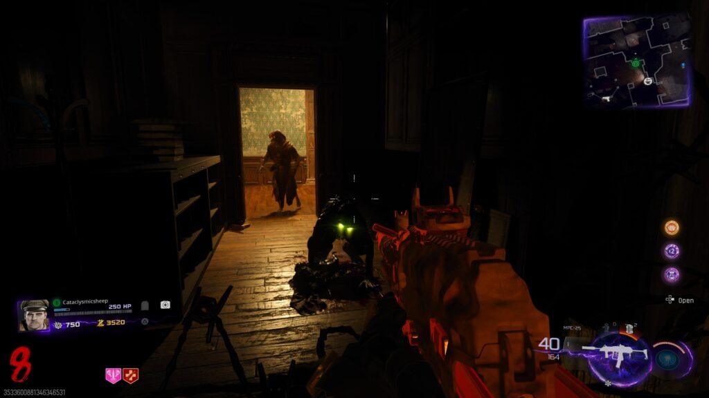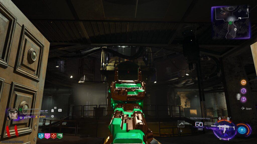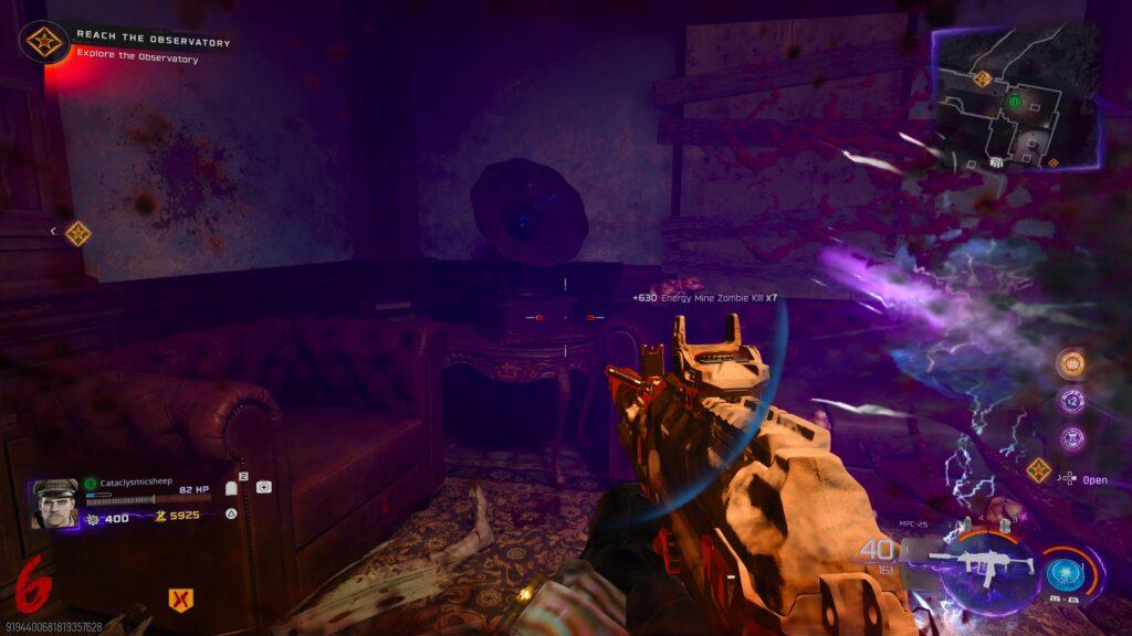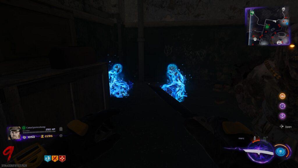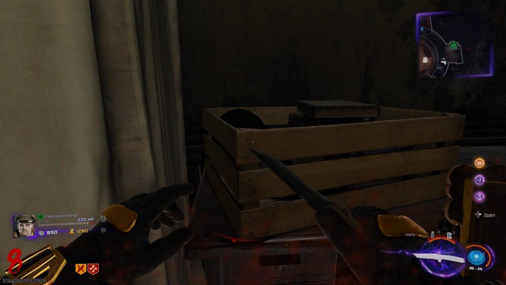 Ahora dirigete al tocadiscos ubicado en el centro de la sala pegado al arma de pared. Interactúa para insertar el vinilo y ahora podrás cargarlo de almas. Elimina zombis CUERPO A CUERPO frente al tocadiscos activado. Verás como las almas moradas se introducen en el tocadiscos. Tras aproximadamente 5 almas, el tocadiscos tocará una canción y cuando termine soltará la ventaja aleatoria y algunos restos.