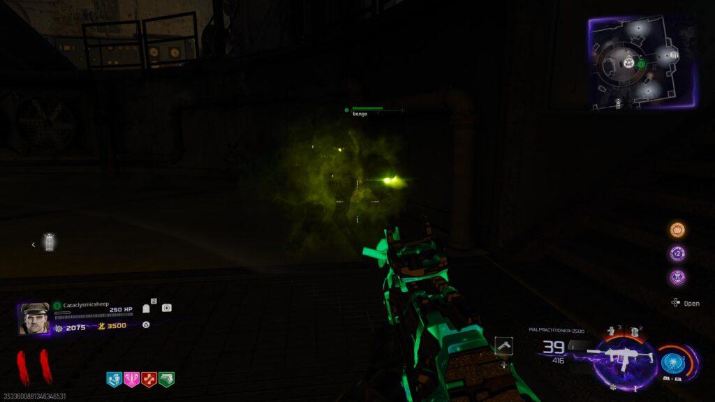 Ese punto verde marca el punto de aparición de Bongo. Búscalo en las ventanas o agujeros por los que aparecen los zombis. Cuando veas unos ojos verdes brillantes, utiliza tu granada táctica para lanzar al robot de juguete. Bongo se acercará a comérselo y cuando termine desaparecerá.